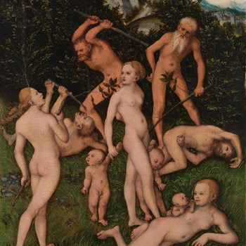 The subject of this painting has been much debated, but it’s generally thought to show an imagined view of a past and primitive society. Cranach made a number of similar paintings from 1527 to 1535. Since the twentieth century it has been assumed that the origin of the subject lies in a classical source. Two pairs of men are fighting – violence which is more disturbing for its close proximity to three small children. While one woman watches the fighting with a look of shock on her face, another is staring at something over her shoulder, beyond the picture frame. A third woman seems unaware of – or unconcerned by – the chaos around her. Their primitive behaviour takes place outside the realm of civilised society, represented by the buildings in the distance.