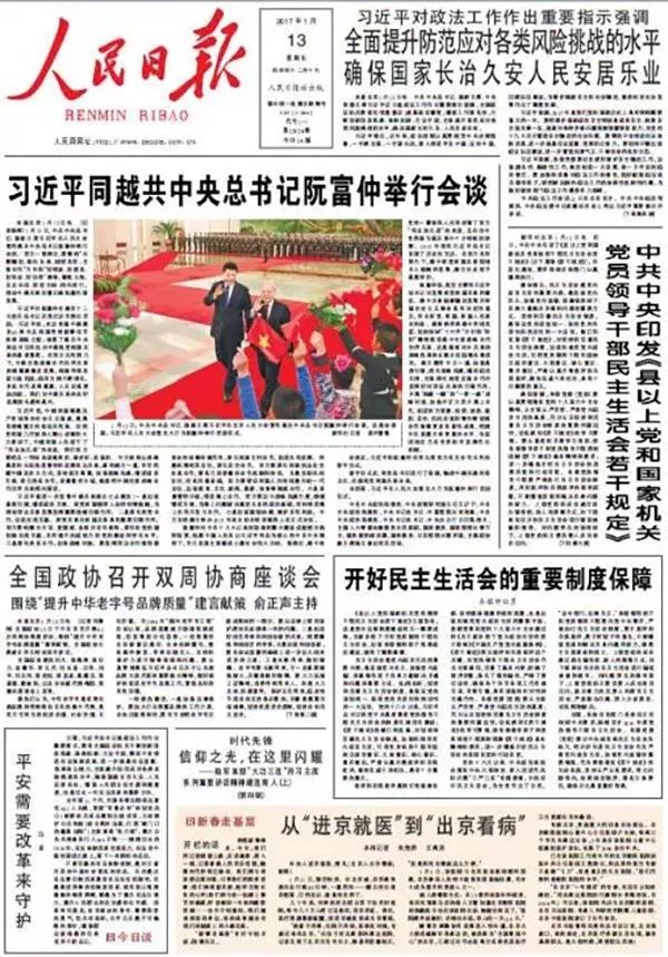 “网络新闻联播”微信公号11月14日消息,11月12日,中共中央总书记、国家主席习近平抵达河内,开始对越南社会主义共和国进行国事访问。 11月13日,习近平同越共中央总书记阮富仲在胡志明故居进行会晤。在会晤中,习近平亲自送上了一份特殊的国礼给阮富仲——19期《人民日报》报纸。 以下是此次赠送的19期人民日报全目录。